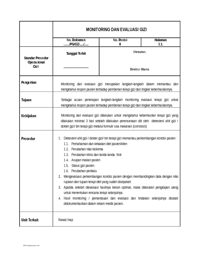 Monitoring dan evaluasi terhadap pelaksanaan reformasi birokrasi satuan kerja pusatpuslit dan balailoka di lingkungan lipi sesuai dengan road map reformasi birokrasi 2015 2019 yang telah ditetapkan. Evaluasi ini merupakan pelaksanaan pengelolaan dana bos tahun anggaran 2018 triwulan 1 sd triwulan 4 dan tahun anggaran 2019 triwulan 1 sd. Selain itu pedoman monitoring dan evaluasi kurikulum ini selain sebagai pegangan monitoring dan evaluasi juga menjadi rujukan baik bagi institut maupun fakultas dalam melaksanakan proses pembelajaran berdasarkan penerapan kkni serta meneliti kekurangan kelemahan sekaligus menemukan sebuah solusi terbaik bagi iain purwokerto. Komponen dan aspek pengukuran. Semua organisasi pasti menyimpan rekaman dan catatan pembahasan apa yang telah mereka kerjakan. Monitoring menghasilkan informasi yang membantu menjelaskan bagaimana akibat kebijaksanaan dan mengapa antara perencanaan dan pelaksanaannya tidak cocok penilaian evaluasi merupakan tahapan yang berkaitan erat dengan kegiatan monitoring karena kegiatan evaluasi dapat menggunakan data yang disediakan melalui kegiatan monitoring.