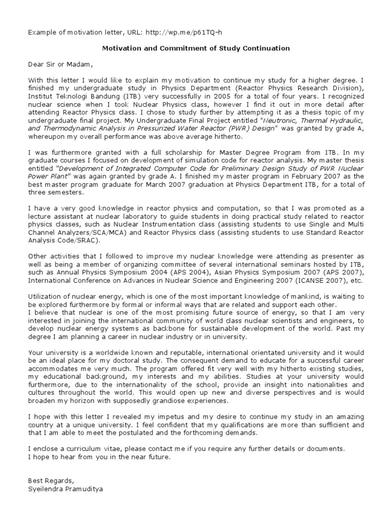 Contoh motivation letter pdf. Motivation letter merupakan sebuah surat yang berisi tentang penjelasan akan motivasi kita untuk bergabung kedalam sebuah perusahaan ataupun untuk melamar sebuah beasiswamotivation letter merupakan surat yang dianggap sangat penting yang akan mendampingi cv atau curriculum vitae karena. Download motivation letter 2 contoh motivation letter. Letter of motivation for scholarship sample pdf doc up to the pointif you are college aspirant and want to know about master degree sample motivation letter then i know this will provide great help to you and your loved one and i am glad to say that i too have gone through dozens of activities and found myself up to this place while going through this content. Tips dan contoh menulis motivation letter dalam bahasa inggris mungkin sebagian dari sahabat sbi ada yang belum paham mengenai apa itu motivation letter dan apa guna nya. Cara dan contoh membuat motivation letter paling dipertimbangkan dalam melamar kerja dan beasiswa. Melalui pembuatan motivation letter inilah yang akan membuat anda lebih mudah dikenali oleh pihak perusahaan.