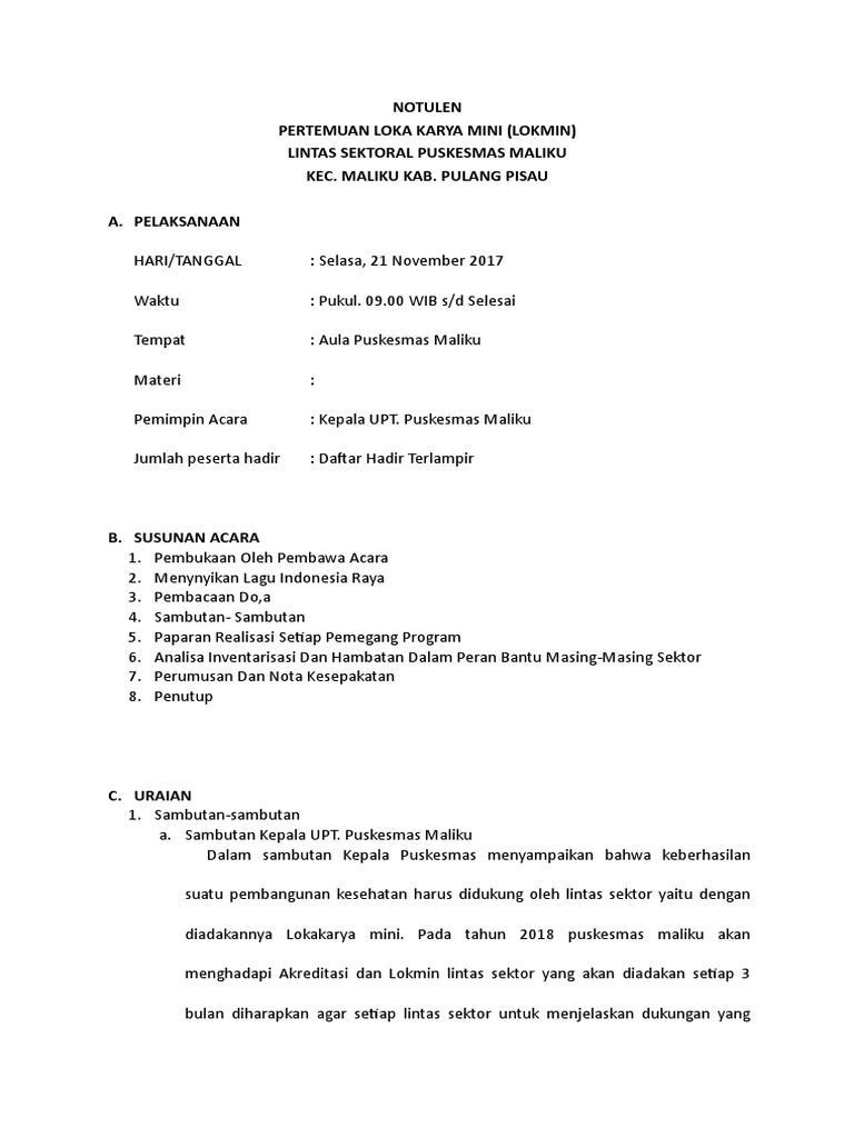 Contoh notulen lokakarya mini puskesmas. Wadah ini menjadi sumber penting perencanaan dan penjaringan umpan balik pada rencana usulan maupun rencana pelaksanaan kegiatan puskesmas. Doc notulen lokmin puskesmas tanggulangin academiaedu. Dari proses lokakarya mini baik bulanan maupun tribulanan diharapkan dapat dilakukan pemantauan dan pengendalian pelaksanaan kegiatan puskesmas berdasarkan rencana pelaksanaan kegiatan rpk puskesmas identifikasi permasalahan yang dihadapi selanjutnya dilakukan rumusan pemecahannya sehingga dapat dilakukan perbaikan rencana kegiatan untuk periode berikutnya secara berkesinambungan. Notulen lokmin puskesmas tiap bulan by yulia 462969 in types school work notulen lokmin puskesmas bulanan. Lokakarya mini atau lokmin bulanan puskesmas bukanlah hal baru bagi petugas puskesmas karena kegiatan ini wajib dilaksanakan karena merupakan bagian dari manajemen puskesmas itu sendiri. Sebagimana tercantum pada pedoman perencanaan tingkat puskesmas.
