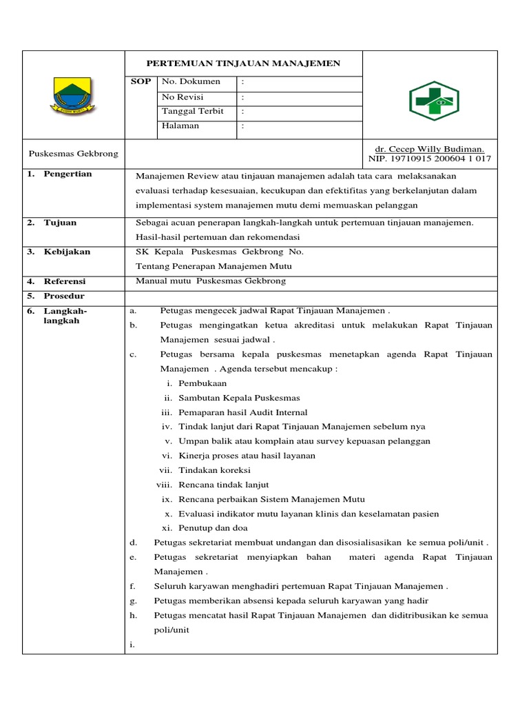 Ini adalah contoh mengenai sop monitoring pelaksanaan kegiatan program dan pelayanan yang ada di puskesmas. Contoh bentuk laporan qc quality control contoh bentuk laporan qc untuk kontraktor. Perlu diingat bahwa dalam rtm ini perlu dibahas dahulu hasil rapat sebelumnyabagaimana dengan tindak lanjutnya apakah sudah dilaksanakan dengan baik dan selain itu juga diupayakan kejelasan agenda yang akan dibahas maka disini akan sedikit dijelaskan apa saja agenda yang perlu dibahas dalam rapat pertmuan tinjauan manajemen puskesmas. Rapat tinjauan manajemen management review meeting pada hakikatnya merupakan salah satu kegiatan wajib yang mesti dilakukan suatu institusiperguruan tinggi yang sudah atau baru mulai menerapkan melaksanakan sistem penjaminan mutu internal spmi. 1 dari 1 notulen rapat tinjauan manajemen no. Dengan bergai macam cara.