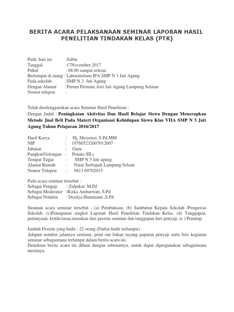 Contoh notulen seminar penelitian tindakan kelas yang bisa anda unduh secara gratis dengan menekan tombol download yang ada pada tautan dibawah ini. Notulanotulen rapat adalah ringkasan tentang jalannya rapat seminar diskusi atau sidang dan hal yang dibicarakan serta diputuskan dalam rapat tersebut dari awal acara sampai akhir acara. Blog ini berisi konten tentang juknis ptk untuk angka kredit contoh laporan ptk yang sudah dinilai contoh lampiran seminar ptk contoh lengkap lampiran ptk. Posting lebih baru posting lama beranda. Monday december 30 2019. Demikian berita acara ini dibuat dengan sebenarnya untuk dapat dipergunakan sebagaimana mestinya.