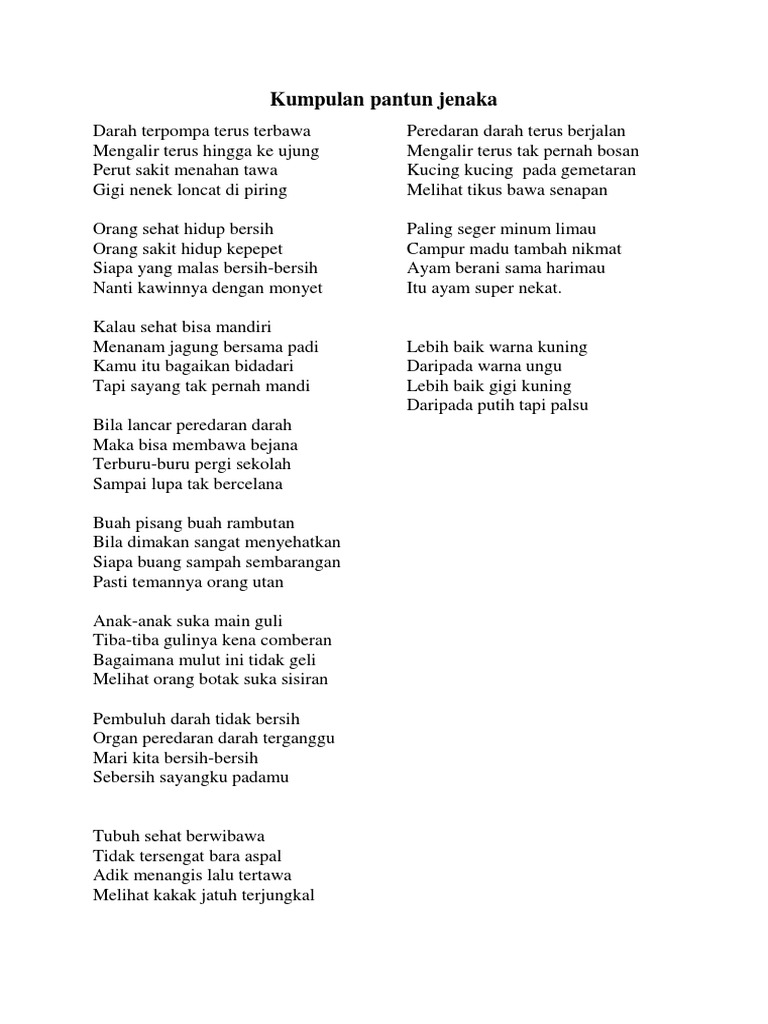 Contoh pantun jenaka anak. Khusus dalam artikel ini admin membahas mengenai pantun anak anak. Pantun anak anak pantun adalah jenis puisi lama dalam bahasa bahasa nusantara. Satu titik dua koma anak monyet memanfaatkan gincu lihat anak kelas lima. Pantun ini juga tersedia untuk semua kalangan seperti anak anakremaja dan bahkan dewasa. Ini contoh pantun jenaka untuk anak sekolah dasar. Nah ditambah jika pantun tersebut tidak mencapai target yang diinginkan maka esensinya pun akan jauh berkurang.