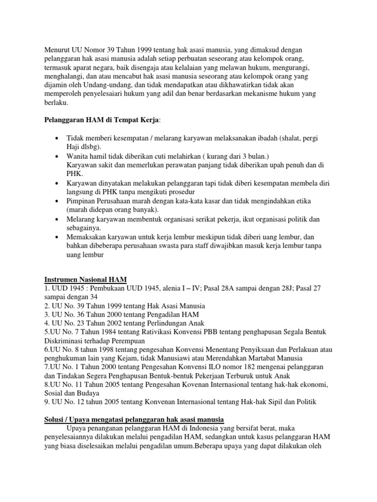Selain menjelaskan tentang ham saya juga akan menjelaskan tentang pengertian dan contoh pelanggaran ham. Karena pentingnya mengerti ham sebab banyak orang yang secara tidak langsung melanggarnya. Hampir dapat dipastikan dalam kehidupan sehari hari dapat ditemukan pelanggaran hak asasi manusia baik di indonesia maupun di belahan dunia lain. Orang tua yang memaksakan keinginannya kepada anaknya tentang masuk sekolah memilih pekerjaan dipaksa untuk bekerja memilih jodoh. Contoh pelanggaran ham dalam lingkungan keluarga antara lain 1. Contoh pelanggaran ham dalam kehidupan sehari hari.