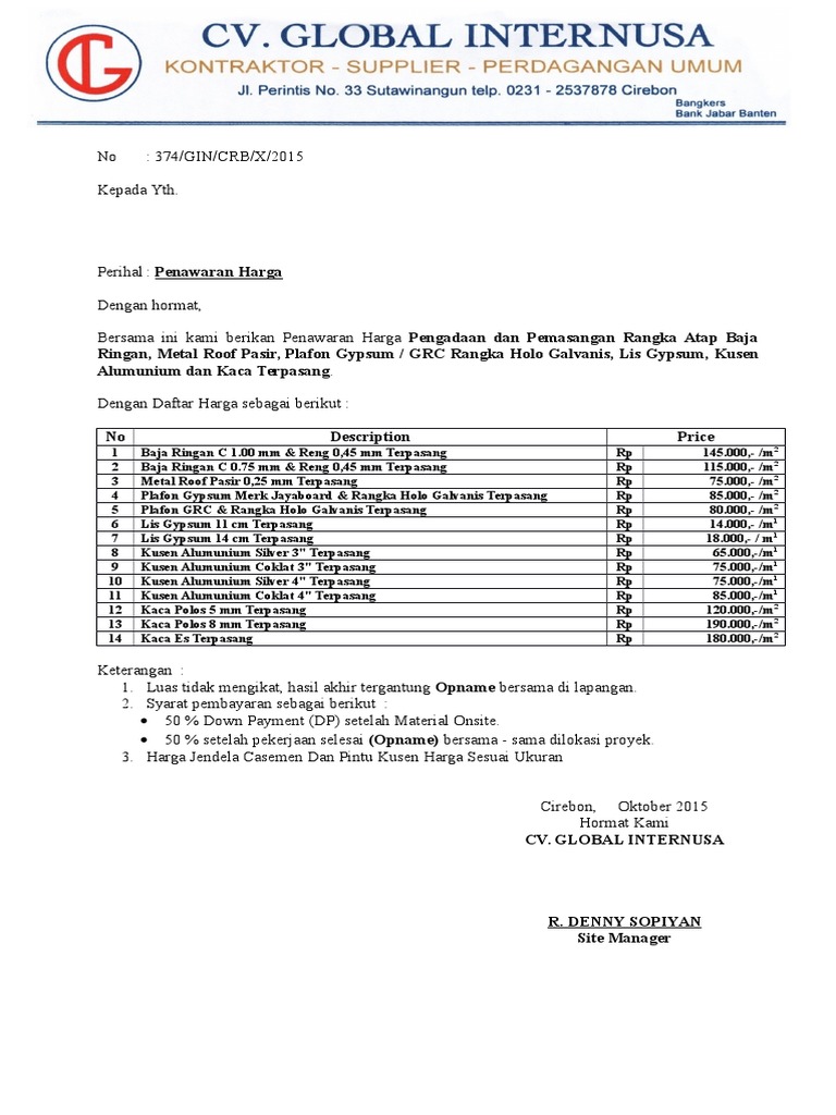 Heri afandidi jakartadengan hormatbersama ini kami sampaikan surat penawaran harga untuk pembuatan rolling door dengan spesifikasi sebagai berikut. Surat penawaran proyek dapat dibuat dengan menggunakan software pengetikan seperti microsoft excel atau microsoft word format diatas hanya sebagai contoh yang dapat dirubah dan disesuaikan dengan standar perusahaan masing masing atau menyesuaikan format penawaran yang diminta oleh pemilik proyek. Maka dari itu kankim memilihkan tema atau template contoh surat penawaran harga untuk proyek untuk dijadikan inspirasi ide ataupun acuan dalam penulisan penawaran anda. Pada artikel kali ini kita akan membahas mengenai contoh surat penawaran barang dan harga lengkapsebagai informasi surat penawaran barang dan hargaadalah surat yang dibuat dan ditujukan kepada suatu perusahaan yang tujuannya yaitu untuk menawarkan suatu barang atau produk ke perusahaan tersebut beserta detail harganya. Jenis surat ini tergolong masih merupakan salah satu jenis surat yang masih relevan untuk digunakan pada saat sekarang ini. Surat penawaran seringkali berbentuk formal dan dengan jelas juga mencantumkan rincian harga juga barang yang ditawarkan akan dijual.