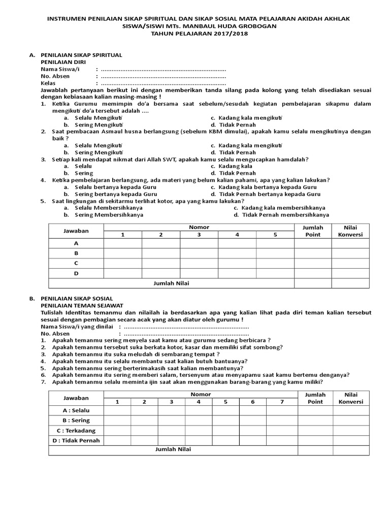 Contoh penilaian sikap sosial. Download format buku penilaian sikap spiritual dan sikap sosial ki 1 ki 2 kurikulum 2013 sdmi tahun pelajaran 20192020 catatan. Melainkan semua guru mata pelajaran wajib melakukan penilaian sikap terhadap perkembangan sikap spiritual dan sosial peserta didik. Pada akhir semester guru mata pelajaran dan wali kelas berkewajiban melaporkan hasil penilaian sikap baik sikap spiritual dan sikap sosial secara integratif. Laporan penilaian sikap dalam bentuk nilai kualitatif dan deskripsi dari sikap peserta didik untuk mata pelajaran yang bersangkutan dan antarmata pelajaran. Adapun topik pembahasan yang akan dibagikan yaitu tentang contoh indikator penilaian sikap spiritual dan sikap sosial pada kurikulum 2013. Langkah yang harus ditempuh dalam penilaian sikap adalah melakukan perencanaan.