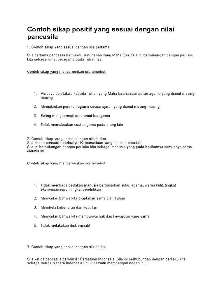 Contoh perilaku yang sesuai dengan pancasila. Ketuhanan yang maha esa. 10 butir pedoman penghayatan dan pengamalan sila ke 2 kedua pancasila ada 10 butir pedoman pengamalan sila ke 2 yang terdapat dalam 45 butir pedoman penghayatan dan pengamalan pancasila. Berikut ini adalah contoh perilaku perilakku yang menerapkan nilai nilai pancasila di berbagai kehidupan baik itu di keluarga masyarakat bangsa dan juga negara. Mengembangkan sikap saling menghargai antar suku agama ras dan antar golongan. Sikap dan perilaku yang sesuai dengan nilai pancasila sila ke 3 antara lain. Sikap positif yang sesuai dengan sila keliga adalah menjunjung tinggi nilai nasionalisme yang diiunjukkan dengan cara menempaikan persatuan kesatuan serta kepentingan dan keselamatan bangsa dan negara di atas kepentingan pribadi.
