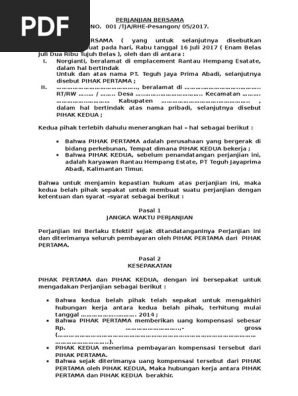 Contoh perjanjian kerja bersama pdf. Perjanjian kerja bersama ini para pihak diberikan kesempatan yang sama dan tidak membedakan perlakuan berdasarkan gender suku agama ras dan golongan 5. Kesejahteraan yakni pelaksanaana perjanjian kerja bersama diarahkan guna mewujudkan kesejahteraan pekerjaburuh dan pertumbuhan perusahaan. Selama dalam hubungan kerja pekerja dan perusahaan terikat untuk mematuhi perjanjian kerja bersama pkb yang berlaku. Contoh surat perjanjian kerja karyawan. Selain mencari contoh surat perjanjian kerjasama doc mungkin ada beberapa orang juga yang mencari contoh surat perjanjian kerjasama pdf. Surat kesepakatan bersama bukan hanya biasanya dibuat oleh perusahaan melainkan juga biasanya dibuat oleh seseorang yang berkeinginan untuk melakukan perjanjian atau kesepakatan kerjasama demi mencapai keuntungan dan tujuan bersama.