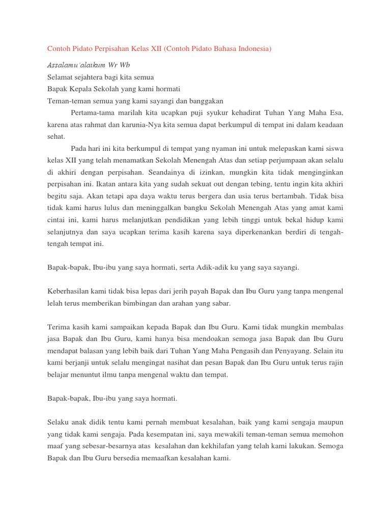 Berikut ini contoh pidato perpisahan sebagai. Lengkap pidato perpisahan yang indah dan menyentuh hati bagi para pendengar. Kumpulan contoh pidato perpisahan sekolah kelas 6 9 dan sma smk kelas 12. Assalamu alaikum warahmatullahi wabarakatuh. Meskipun singkat namun kata kata pidatonya dijamin sangat mengharukan sehingga bisa membuat pendengar merasakan bagaimana harunya yang namanya perpisahan. Puji syukur kita panjatkan kehadirat allah swt yang telah memberikan kita rahmat hidayah dan taufik nya sehingga kita bisa hadir di tempat ini guna melaksanakan acara perpisahan kelas 12 sma negeri 1 bagor tahun ajaran 2015 2016.