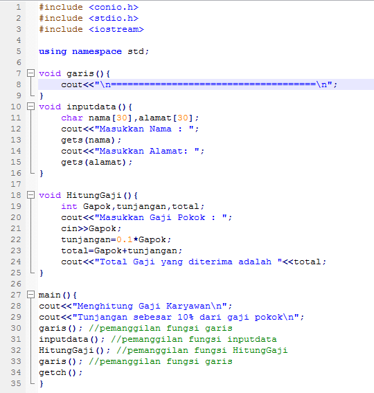 Contoh program c menggunakan fungsi. Fungsi ini memang wajib ada di setiap program c karena fungsi inilah yang akan dieksekusi pertama kali saat. Jika dalam pemrograman pascal kita mengenal prosedur dan fungsi maka dalam bahasa pemrograman c kita akan menyebut keduanya sebagai method. Fungsi merupakan sub program yang berguna untuk membuat program dapat menjadi medular sehingga akan lebih mudah dipahami dan dapat digunakan kembali baik untuk program itu sendiri maupun untuk program lain yang memiliki proses yang sama. Fungsi adalah sub program yang bisa digunakan kembali baik di dalam program itu sendiri maupun di program yang lain. Tentu saja semua fungsi yang bakalan kamu buat tidak akan berjalan sendiri sendiri namun bekerja atas dasar panggilan atau koordinasi fungsi. Fungsi dapat menerima input dan menghasilkan output.