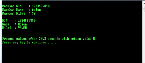 Contoh program struct c data mahasiswa struct bisa kita sebut sebagai tipe data yang kompleks dimana mempunyai sekumpulan variabel atau properti yang di definisikan didalam satu bentuk data. Program c struct data mahasiswa program yang akan kita belajar kali ini adalah program dengan struktur algoritma sekuensial dimana program mengeksekusi setiap sintak dari awal hingga akhir tanpa ada perulangan maupun percabanganoleh sebab itu sebenarnya program ini termasuk sangat sederhana namun bagi pemula contoh program ini sudah cukup bagus sebagai bahan pembelajaran. Ada baiknya langsung ke kasus contoh saja mengenai struct dalam bahasa c ini saya kalo misalkan teori teori yang hanya bicaratulisan itu kadang tidak terlalu paham benar jadi malahan mending praktek mencoba semua daripada teori tapi jangan juga menyepelekan teori karena kalo kita tau contoh dan paham tentang itu pembahasan berserta contohnya kadang kan kalo di suruh jawab apa itu dan. Dimana variabel array dapat menampung banyak nilai dengan tipe yang sama pada struct kelebihannya adalah bisa menyimpan banyak variabel dengan tipe yang berbeda beda. Setiap tipe data dapat dibuat dalam bentuk array. Contoh kasus yaitu ketika ingin membuat suatu program mengolah data mahasiswa dimana data mahasiswa terdiri dari nim nama dan nilai.