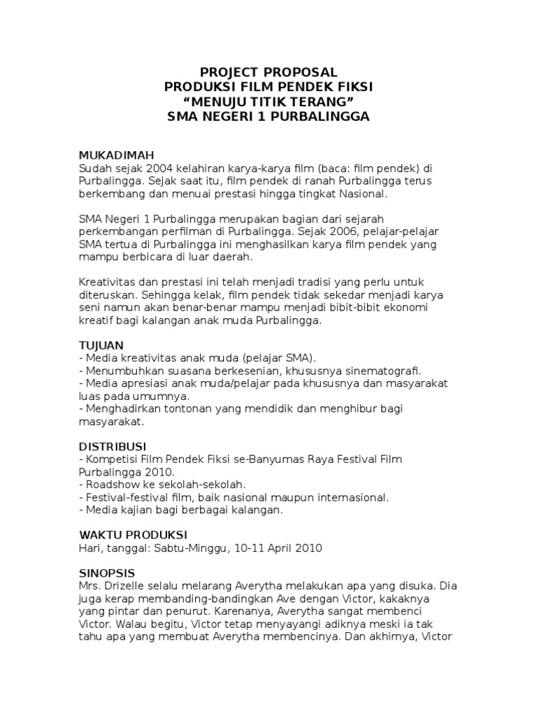 Walaupun hanya berdurasi 5 menit 10 menit sampai maksimal 30 menit sebuah film pendek ini harus dibuat sepadat mungkin. Mukadimah sudah sejak 2004 kelahiran karya karya film baca. Proposal komunikasi pemasaran filmcahaya di atas cahaya 2. Project proposal produksi film pendek fiksi menuju titik terang sma negeri 1 purbalingga. Latar belakang film adalah karya cipta seni dan budaya yang merupakan salah satu media komunikasi massa audiovis ual yang dibuat berdasarkan asas sinematografi yang direkam pada pita seluloid pita video piringan video danatau bahan hasil penemuan teknologi lainnya dalam segala bentuk jenis dan ukuran melalu i proses kimiawi proses elektronik atau proses lainnya dengan atau tanpa. Contoh proposal sponsordhip film 1.