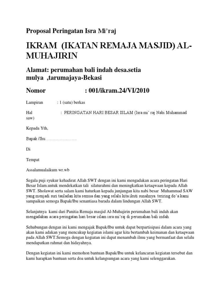 Contoh proposal kegiatan isra mi raj remaja masjid. Demikian proposal kegiatan peringatan isra miraj nabi muhammad saw 1431 h yang dilaksanakan di masjid al muhajirin peru. Jamanis kabupaten tasikmalaya 46175 nomor. Harapan kami agar kegiatan ini mampu menjadi motivasi dan inspirasi. Proposal isra miraj nabi muhammad 1436 h proposal isra miraj di sekolah proposal isra miraj document proposal isra miraj pdf proposal isra miraj 2015 proposal isra miraj smp proposal isra miraj doc proposal isra miraj 2011 proposal isra miraj 2013 proposal isra miraj 2014 proposal isra miraj sma 2017. Demikian proposal ini kami buat dengan harapan kegiatan phbi isra miraj nabi muhammad saw di tahun 201 7 ini berjalan lancar sukses dan mendapat apresiasi penuh dari semua pihak. Proposal kegiatan peringatan isra miraj nabi muhammad saw 1433h 2012 m i.