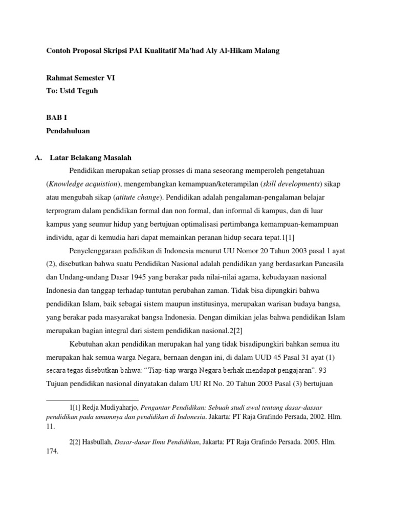 Contoh proposal skripsi pai tarbiyah pdf files transportsoup jika temen temen membutuhkan ide judul skripsi tarbiyah atau pendidikan agama islam maka berikut ini saya sajikan daftar contoh judul skripsi tarbiyah pendidikan agama islam pai terbaru mudah dikerjakan. Selamat datang diblog kami. Berdasarkan judul skripsi yang mereka angkat maka penulis akan mengadakan penelitian. Contoh lengkap proposal metode penelitian kualitatif pada kesempatan kali ini saya akan memberikan contoh lengkap dalam pembuatan proposal metode penelitian kualitatif yang baik dan benar untuk menjadikan refrensi ataupun contoh untuk pembuatan penelitian kualitatif yang sebenarnya. Latar belakang masalah pendidikan merupakan setiap prosses di mana seseorang memperoleh pengetahuan knowledge acquistion mengembangkan kemampuanketerampilan skill developments sikap atau mengubah sikap atitute change. Metode penelitian kualitatif saat anda mengijak perguruan tinggi dan menginjak semester akhir biasanya akan di beri tugas untuk membuat karya penelitian nah salah satunya adalah penelitian kualitatif ini untuk mempermudah anda dalam mencari referensi berikut adalah pembahasa lengkap mengenai metode penelitian kualitatif serta contoh dan pembahasannya.