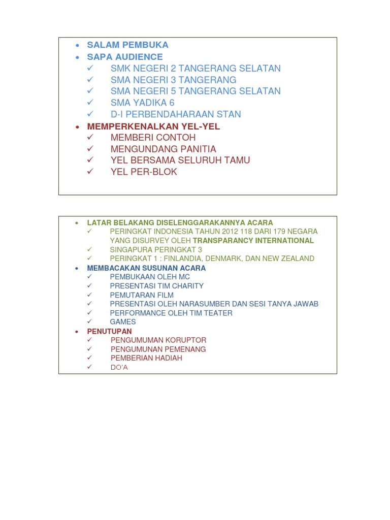 Contoh teks pembawa acara resmi workshop yang terhormat bapak yang terhormat yang terhormat yang terhormat ass. Entah gimana ceritanya kemarin saya ditunjuk menjadi pembawa acara alias mc master of ceremony acara formal di kantor. Kita harus bisa membuat acara lebih segar tidak kaku seperti di acara formal. Contoh teks naskah pembukaan oleh pembawa acara mc. Cue card sebagian orang menyebutnya que card ini tidak hanya berguna bagi mc tetapi juga bagi moderator atau public speaker untuk mencatat poin poin penting yang akan disampaikan ketika berbicara. Untuk yang mau pesan bisa langsung kontak percetakan indis whatsapp 0852 1923 3289 instagram https.