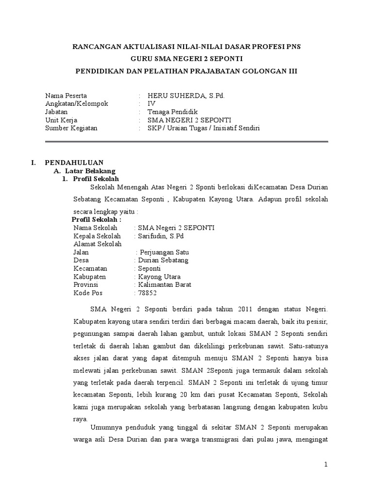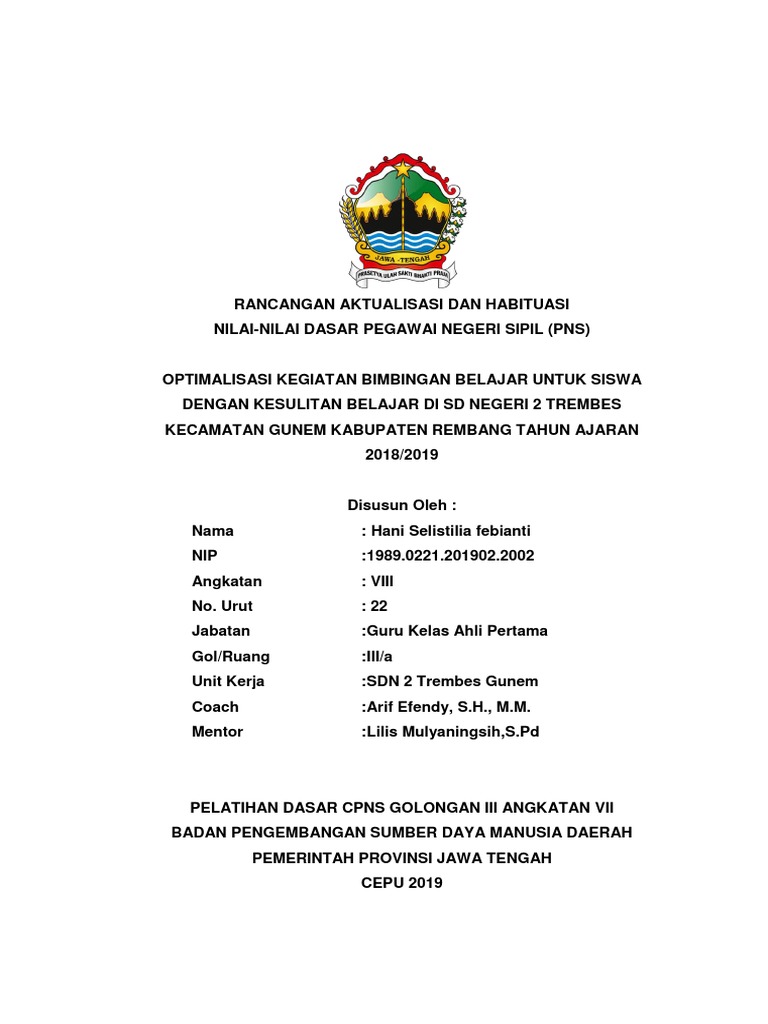 Guru sd smp sma contoh rancangan aktualisasi cpns guru contoh file materi plpg sertifikasi guru tahun 2016 terlengkap semua bidang studi gratis. Sedang aktualisasi nilai nilai dasar pns belum terintegrasi belum terkoordinasi di sd negeri giling 03. Download contoh rancangan aktualisasi latsar asnpns jabatan guru download rancangan aktualisasi laporan rancangan aktualisasi pelatihan dasar asnpns diklat pelatihan dasar golongan iii angkatan vi pemerintahkabupaten mamuju tengah kerjasama dengan pusat kajian dan pendidikan dan pelatihan apratur ii lembaga administrasi negara tahun 2016. Tulis identitas yang jelas salah satu hal penting tapi banyak disepelekan. All the video content owned by youtube uploadervideo creator. Oleh karenanya penulis membuat karya tulis yang berjudul aktualisasi nilai nilai akuntabilitas nasionalisme etika publik komitmen mutu dan anti korupsi di sdn egeri giling 03 kecamatan g u nungwungkal kabupaten pati.