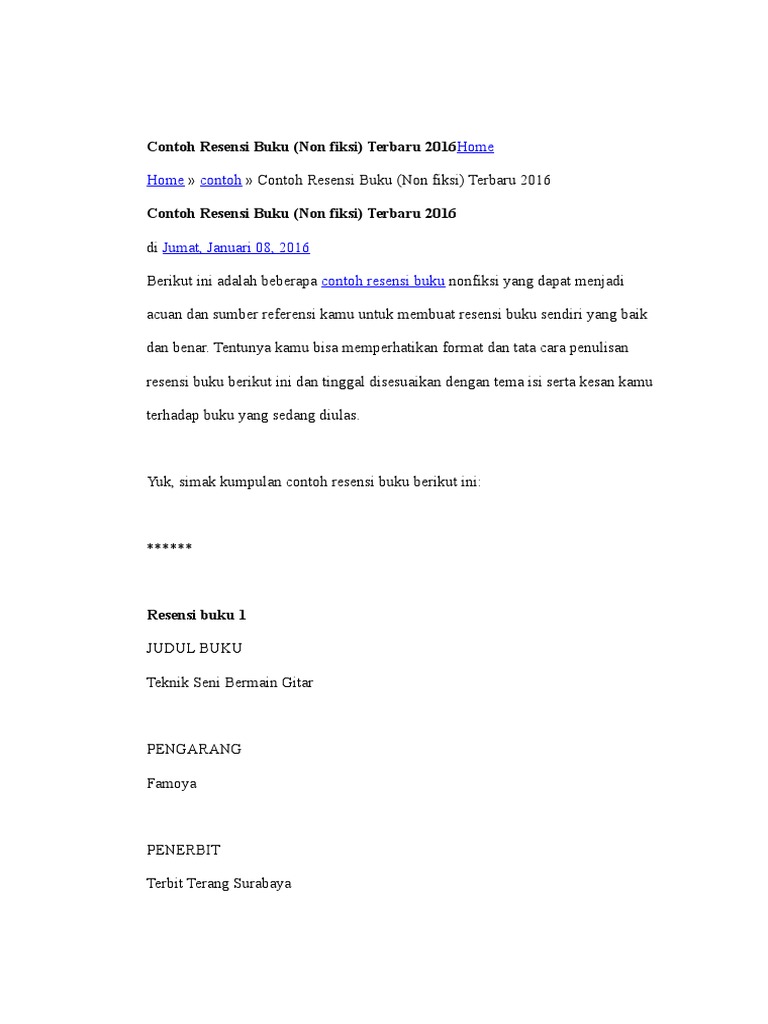 Berikut contoh resensi buku non fiksi yang bisa kamu cek. Nah bagi anda yang bingung membuatnya kami telah sediakan contoh resensi buku non fiksi yang. Pada artikel ini kita akan membahas lengkap mengenai pengertian resensi beserta contoh resensi buku non fiksi. Contoh resensi buku 1. Oke tidak usah berbasa basi langsung saja kita simak artikel yang akan saya berikan ini. Buku non fiksi indonesia terbaik sepanjang masa buku non fiksi indonesia.