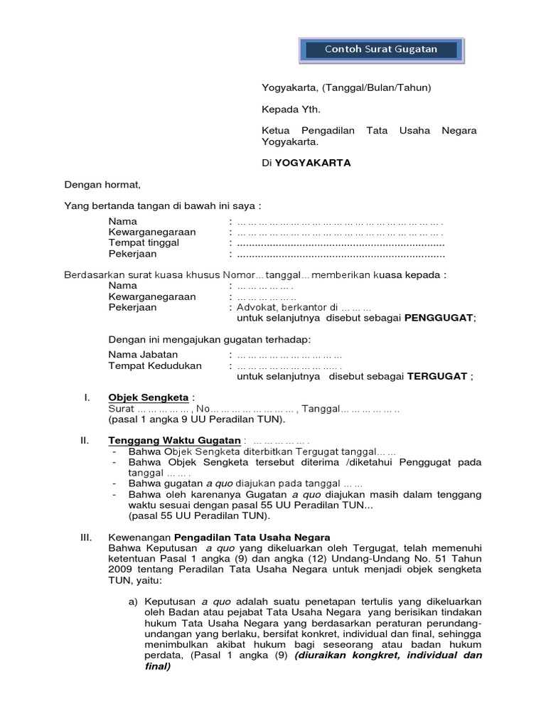 Contoh sengketa tata usaha negara. Dalam menjalankan fungsinya ada dasar dan objek hukum peradilan tata usaha negara yang harus diperhatikan. Sengketa tata usaha negara ini diselesaikan di pengadilan tata usaha negara dengan mengajukan gugatan tertulis yang berisi tuntutan agar keputusan tata usaha negara yang disengketakan itu dinyatakan batal atau tidak sah dengan atau tanpa disertai tuntutan ganti rugi danatau direhabilitasi. Contoh kasus dan putusan pengadilan tata usaha negara yang pertama berkaitan dengan pulau d salah satu pulau buatan yang penggarapannya dilaksanakan oleh pt kapuk naga indah. Sengketa perkara tata usaha negara ini diselesaikan di pengadilan tata usaha negara dengan mengajukan gugatan tertulis yang berisi tuntutan agar keputusan tata usaha negara yang disengketakan itu dinyatakan batal atau tidak sah dengan atau tanpa disertai tuntutan ganti rugi danatau direhabilitasi. Didalam daulah khilafah keputusan tata usaha negara adalah keputusan yang dikeluarkan oleh khalifah atau para penguasa dibawahnya muawin wali dan amil atau keputusan administrasi para ajir atau. Aktivis advokat pejuang khilafah keputusan tata usaha negara adalah keputusan badan atau pejabat tata usaha negara yang bersifat kongkrit individual dan final.