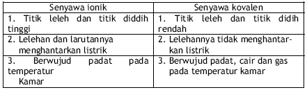 Sifat senyawa ion maupun sifat senyawa kovalen dapat kita jabarkan sebagai berikut. Sebagai besar senyawa senyawa yang dapat membentuk ikatan ion juga memiliki struktur yang keras dan juga mudah patah sementara dalam senyawa kovalen umumnya lebih lunak. Contoh tambahan senyawa yang mengandung ikatan ion dan kovalen sekaligus. Pada umumnya senyawa kovalen pada berbagai wujud tidak dapat menghantar arus listrik atau bersifat non elektrolit kecuali senyawa kovalen polar. Kepolaran dan kelarutannya ikatan ion yang terbentuk melalui ikatan antara ion positif dan ion negative ini menyebabkan senyawa yang dihasilkan dari ikatan yang disebut juga dengan nama homopolar ini bersifat polar. Contoh senyawa kovalen non polar h2 n2 cl2 br2 i2 ch4 ccl4 bcl3 no2 sf6 bf3 co2 dll ok beitulah penjelasan mas dennis mengenai pengertiansifat dan contoh dari senyawa kovalen.
