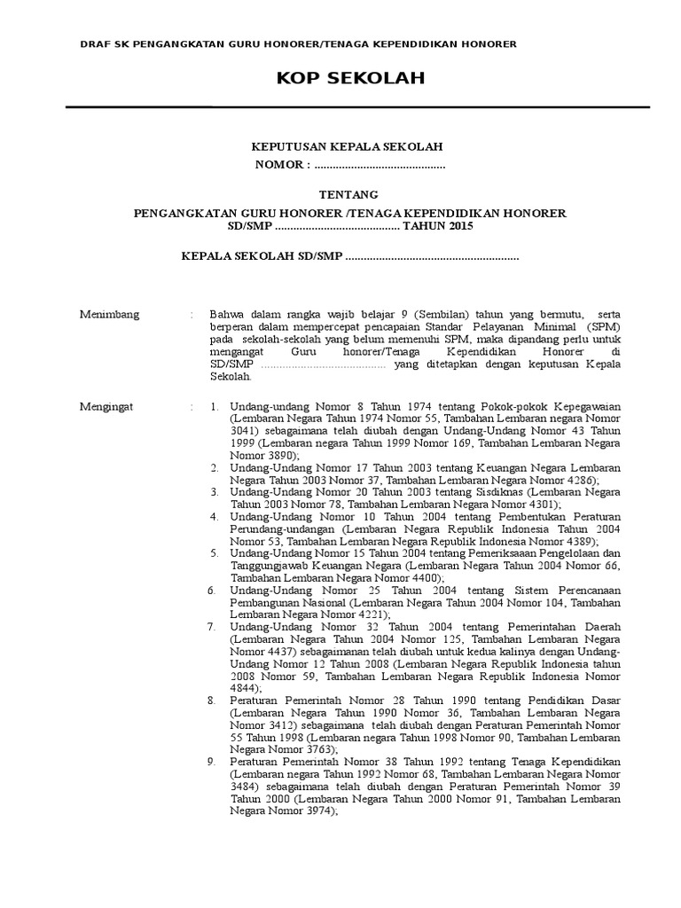 Contoh sk guru honorer terbaru sd smp smasmk tahun 20192020 merupakan sebuah surat keputusan yang diberikan oleh kepala sekolah untuk memenuhi arsip administrasi atau sebagai bukti bagi gtt honor yang akan mengabdi di sekolah tersebutnah bagi anda yang ingin membuat sk namun tidak tahu caranya disini admin kan membagikan conoh sk honorergtt yang dapat anda unduh diakhir postingan ini. Bagi bapakibu guru honorer yang ingin memiliki contoh format surat keputusan sk bupatiwalikota untuk guru honorer terbaru tahun 20172018 bisa di unduh dibawah ini. Untuk mendapatkan sk bupati kita perlu mengajukan permohonan dan persyaratan.