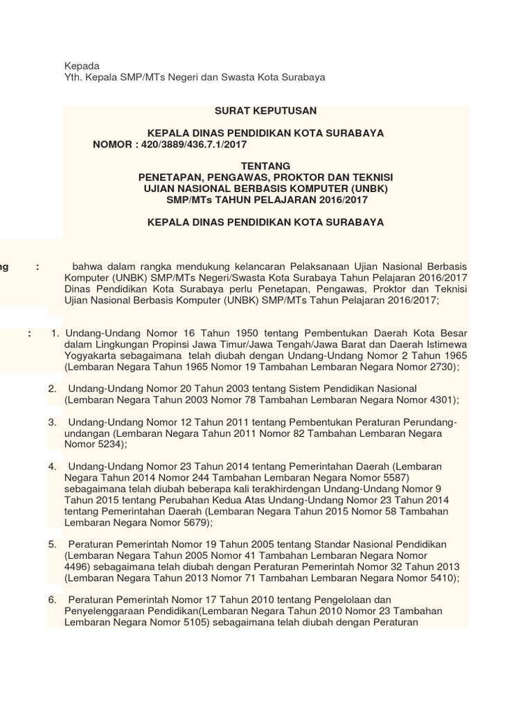 Dalam keputusan yang tertera di dalam surat keputusan tersebut menetapkan mereka yang namanya tercantum dalam lampiran keputusan harus siap ditugaskan dalam pelaksanaan ujian sekolahujian nasional tahun pelajaran 20182018. Contoh sk panitia ujian nasional unbk sd smp sma smk ma silahkan untuk kepala sekolah yang belum membentuk panitia dan belum membuat surat tugas kepenitian ujian nasional berbasis komputer berikut ini kami membagikan contoh surat keputusan yang dapat di pergunakan pada ajaran tahun ini.