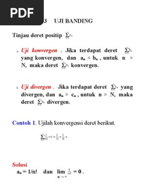 Anda bisa mencari contoh lain dengan memanipulasi bentuk seperti ini memainkan tanda plus dan minus. Jelas kedua deret ini divergen divergen tak sejati. Bahan kuliah fi2101 fisika matematik i. Contoh soal dan pembahasan uji konvergensi deret series convergence tests martha yunanda baris dan deret di bawah ini terdapat beberapa soal mengenai pembuktian uji konvergensi deret atau dikenal dengan series convergence test. Contoh soal deret geometri konvergen deret geometri adalah suatu deret yang mempunya rasio sama pada tiap tiap dua suku berurutan. Jika berbicara deret tak hingga maka tidak akan lepas dari tiga unsur di dalamnya definisi deret tak hingga apa saja bentuk deret tak hingga dan bagaimana kekonvergenan dari suatu deret tak hingga.