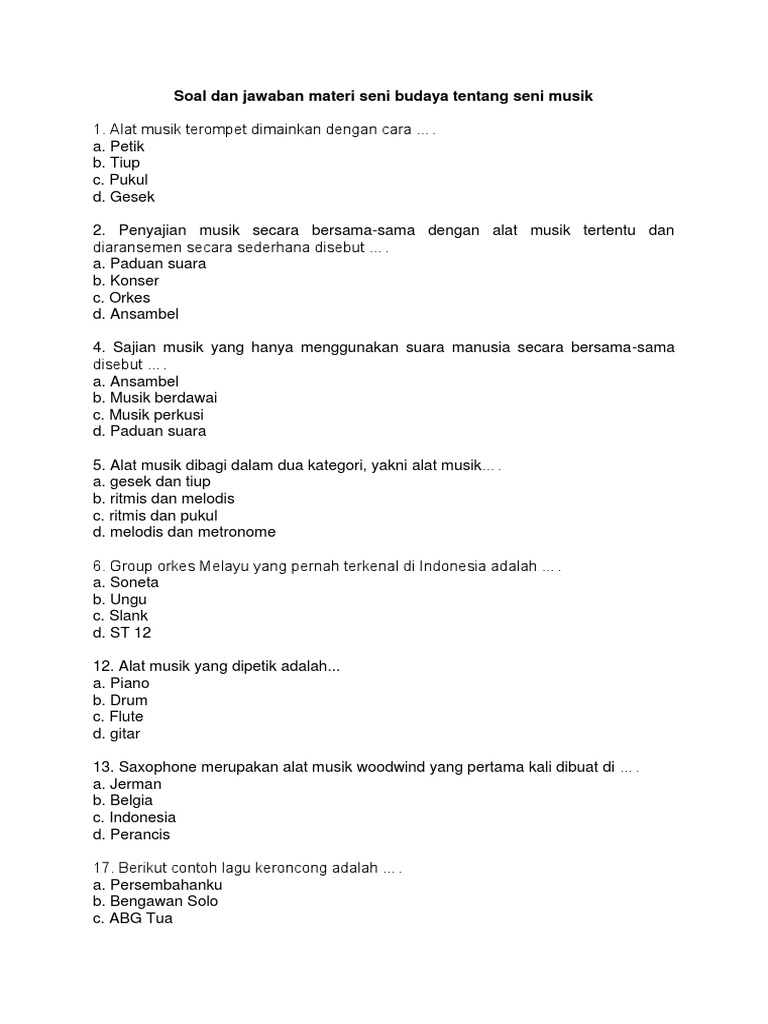 Kali ini kami akan membagikan salah satu soal pelajaran seni budaya cabang seni musik. Contoh alat musik aerofon adalah flute seruling saxophone dll buka juga. Essay bagian ketujuh yang sedang anda baca ini berisikan materi yang sama dengan soal pg sbk kelas x semester 1 bagian kesembilan yaitu tentang apresiasi karya seni tari nusantara. Bunyi yang memiliki irama dan melodilah yang bias dikatakan sebagai musik d. Bunyi tanpa irama bukan merupakan musik c. Contoh soal seni budaya beserta jawabannya 1 minggu 05 januari 2020 dalam postingan kali ini kami akan coba membagikan contoh soal materi pelajaran seni budaya berikut pula dengan jawabannya sekaligus untuk edisi kurikulum 2013 kelas vii smpmts disini kami juga lampirkan kisi kisi soal dan juga kunci jawabannya.