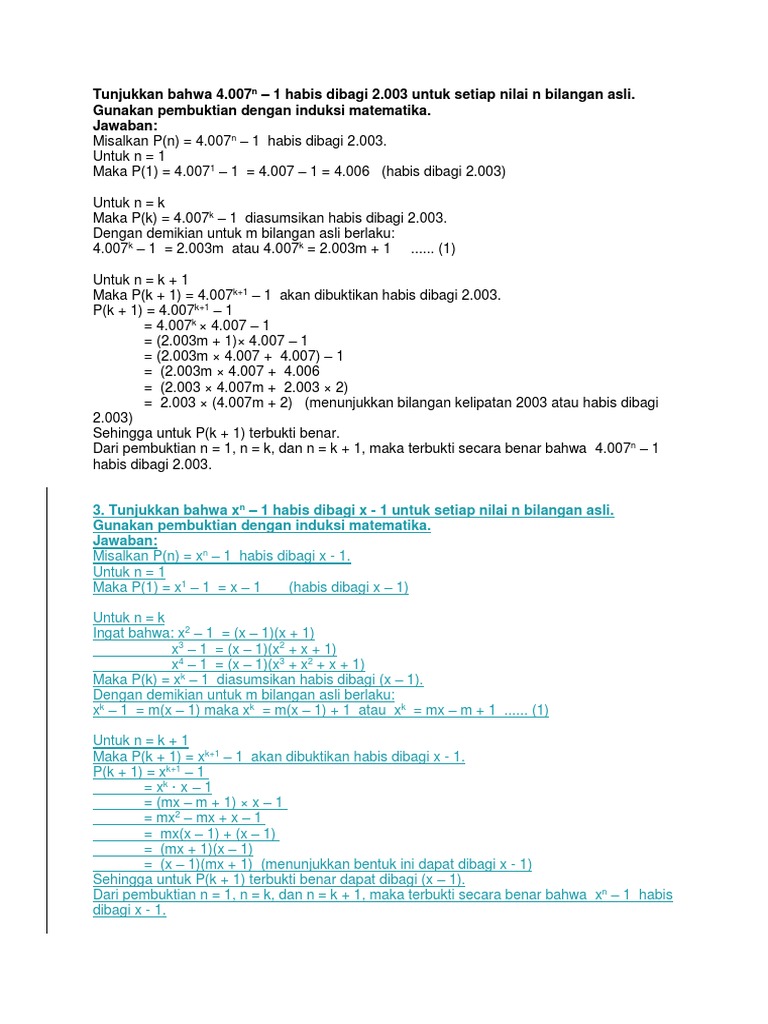 Contoh soal induksi matematika habis dibagi. Induksi matematika merupakan materi yang menjadi perluasan dari logika matematikalogika matematika sendiri mempelajari pernyataan yang bisa bernilai benar atau salah ekivalen atau ingkaran sebuah pernyataan dan juga berisi penarikan kesimpulan. Berdasarkan prinsip induksi matematika terbukti bahwa 6 n 4 habis dibagi 5 untuk setiap n bilangan asli. Untuk n 1 yang sangat jelas habis dibagi 4. Kita anggap 5 k 1 habis dibagi 4 untuk sebarang bilangan bulat. Jika kalian ingin memahaminya dengan jelas silahkan kalian simak materinya dibawah ini gaes. Untuk saat ini akan dibahas pembuktian suatu persamaan yang habis dibagi dengan menggunakan induksi matematika.