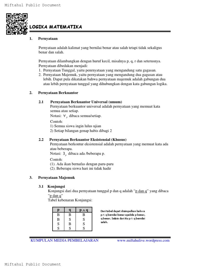Suatu ungkapan yang diterapkan pada kalimat terbuka dengan satu variabel dan dapat mengubahnya menjadi kalimat tertutup disebut kuantor. Download rangkuman contoh soal logika matematika kelas xi11 dalam bentuk pdf klik disini. Rangkuman materi logika matematika lengkap mulai dari rumus tabel kebenaran dan contoh soalnya. Cara yang kedua yaitu dengan melakukan penjabaran atau penurunan dengan penerapan sebagian dari 12 hukum ekuivalensi logika yang ada. Logika matematika adalah cabang logika dan matematika yang mengandung kajian matematis logika dan aplikasi kajian ini pada bidang bidang lain di luar matematika. Dibahas secara mendalam disini.