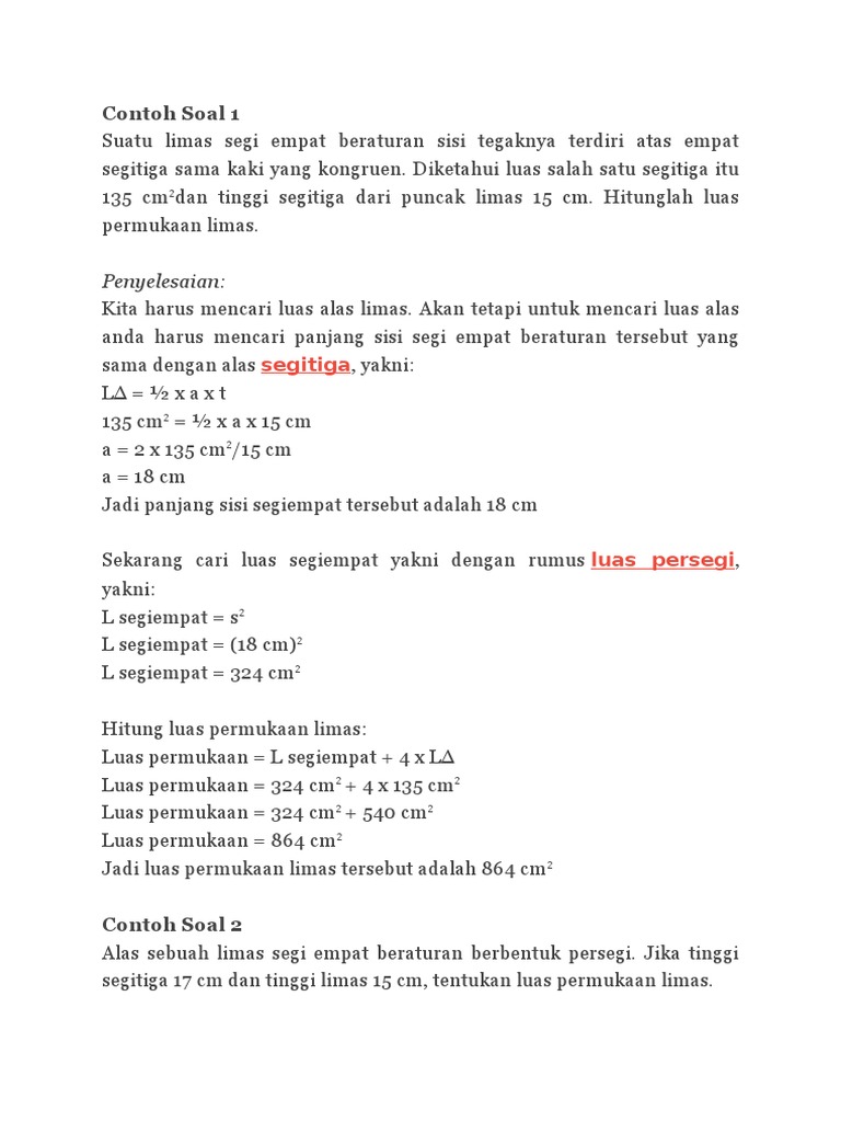 Hitunglah luas permukaan limas tersebut. Ppanjang sisi alasnya 4 cm dan tinggi untuk sisi tegak 6 maka. Luas alas suatu limas dapat serupa segitiga segi empat segi lima atau segi n. Silahkan simak baik baik di bawah ini. Sekarang pada postingan ini mafia online khusus akan mengulas contoh soal serta pembahasan tentang luas permukaan limas. Pada bab ini kita akan membahas materi tentang rumus limas baik dari pengertian dan rumus rumus luas keliling volume dan contoh soalnya.