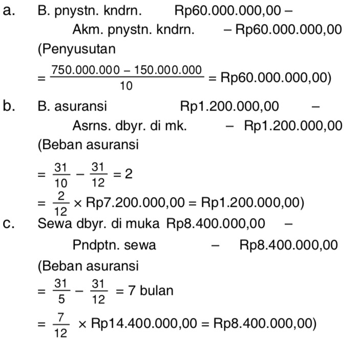 Klik disini untuk contoh soal dan jawaban jurnal sampai neraca saldo dagang perpetual. Dari contoh diatas jumlah neraca saldo sebesar rp 3250000 dan jumlah yang masih ada di gudang rp 1400000 sehingga selisihnya rp 1850000 sebagai biaya perlengkapan salon dengan jurnal penyesuaian sbb. Data penyesuaian per 31 desember 2000 ialah seperti berikut. Asuransi dibayar dimuka rp900000. Pengertian jurnal penyesuaian adalah proses penyesuaian tentang catatan atau fakta yang sebenarnya pada akhir periode akuntansijurnal penyesuaian disusun berdasarkan data dari neraca saldo dan data informasi penyesuaian akhir periode. Estimasi besarnya penyusutan untuk bulan maret 2019 diasumsikan rp 50000.