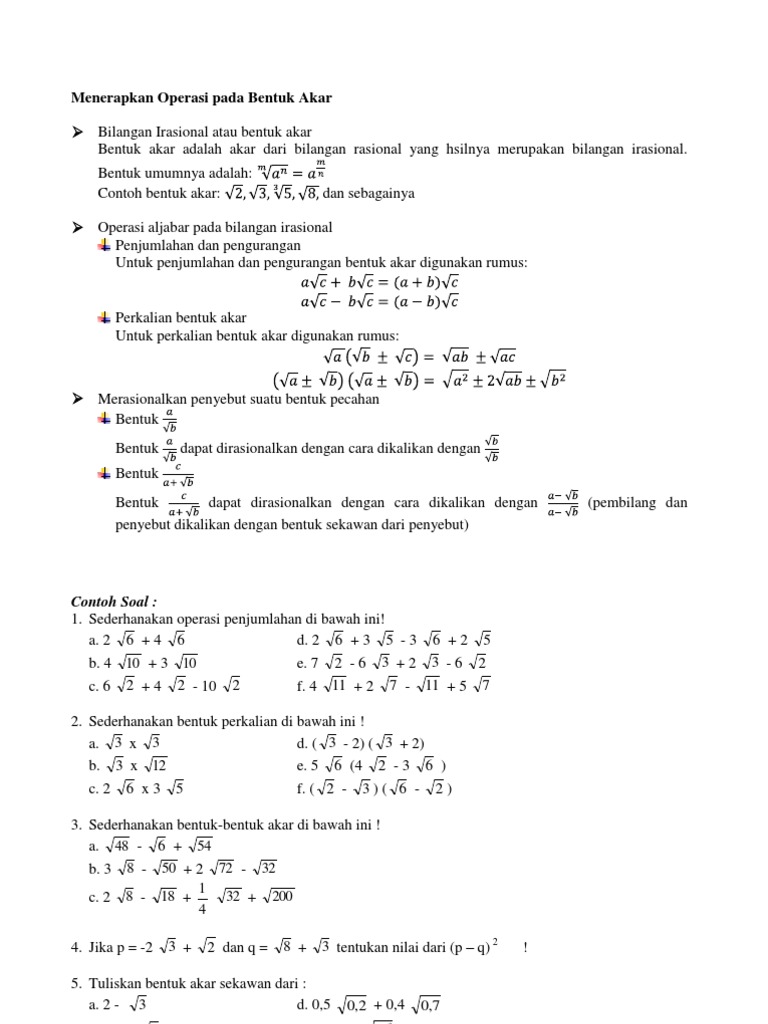 Operasi bentuk akar rumus contoh soal dan pembahasan posted by hidayat at 349 am berikut adalah penjelasan mengenai beberapa jenis operasi bentuk akar beserta rumus contoh dan pembahasannya seperti. Kalau kamu masih ingin mempelajari lagi materi ini langsung saja gunakan ruangbelajarkamu bisa belajar sambil menonton video animasi lengkap dengan soal pembahasan dan rangkumannya.