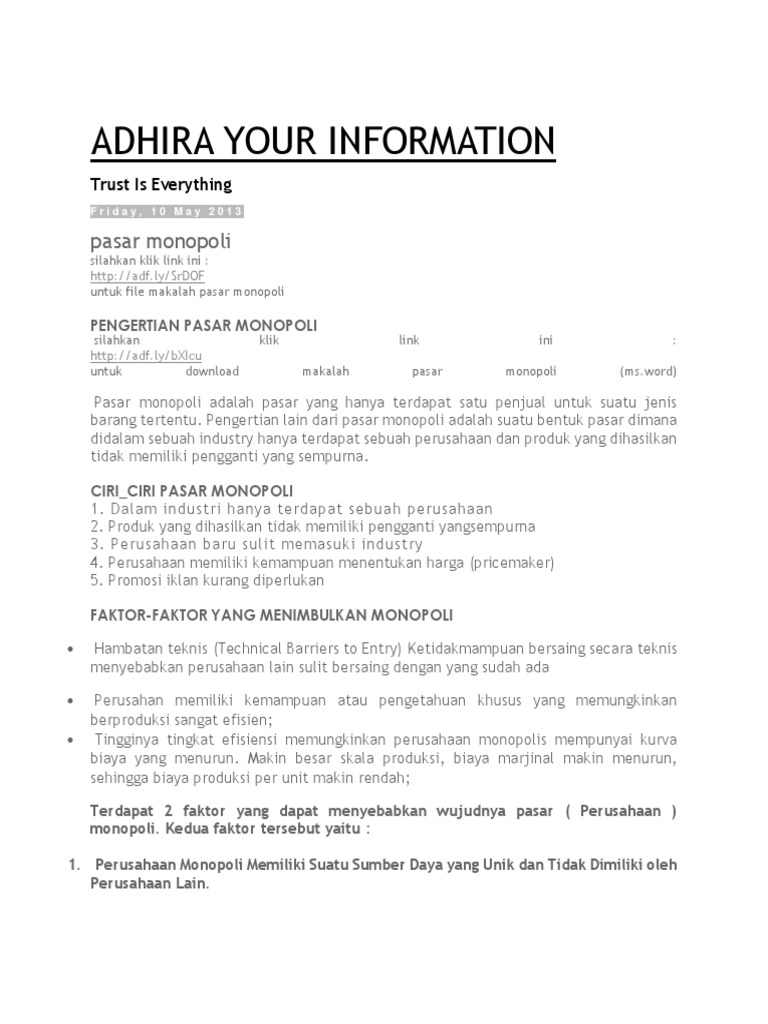 Image pasar monopoli contoh pasar monopoli. Untuk download makalah pasar monopoli msword pasar monopoli adalah pasar yang hanya terdapat satu penjual untuk suatu jenis barang tertentu. Mengapa dalam pasar monopolistik dapat memacu kreativitas produsen. Terdapat tiga faktor yang menyebabkan wujudnya pasar perusahaan monopoli. Output yang dihasilkan adalah 12 unit atau 2 kali jumlah yang dihasilkan bila perusahaan beroperasi dalam pasar monopoli. Orang yang melakukan monopoli terhadap suatu pasar disebut sebagai monopolis.