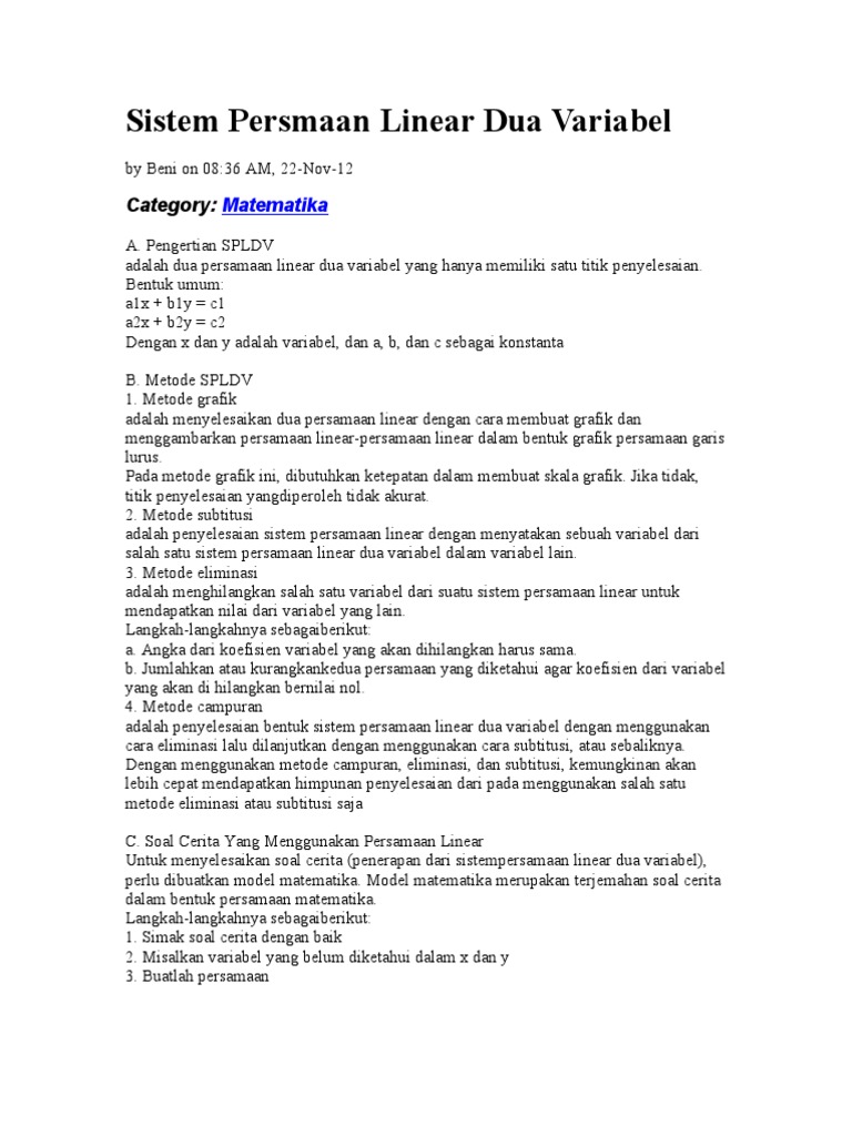 Pada postingan sebelumnya juga sudah dibahas soal cerita persamaan linear satu variabel yang membahas masalah sehari hari. Mula mula kita harus membuat 2 buah persamaan linear dari informasi yang.