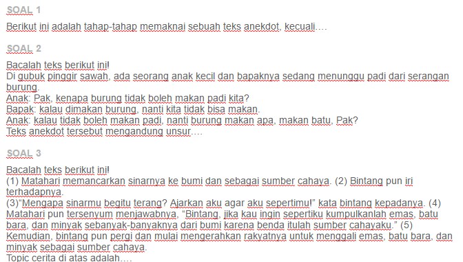 Tujuan tujuan tersebut merupakan latar belakang bagi pengarang atau penulis untuk menulis sebuah teks anekdot. Jika membahas tentang anekdot tentu akan kurang rasanya jika anda tidak memahami ciri ciri struktur dan kaidah dari anekdot itu sendiri. Contoh soal anekdot pilihan ganda dan jawaban ada sekitar 80 butir soal pgpilihan gandapilgan bahasa indonesia tentang teks anekdot dan jawabannya yang bisa adik adik jadikan referensi dalam menghadapi ujian dari guru. Berikut di bawah ini merupakan beberapa tujuan dari penulisan teks anekdot. Berisikan materi yang sama dengan soal essay bahasa indonesia kelas x semester 1 k13 bagian ke 3 yaitu tentang teks anekdot pilihan ganda bagian kelima merupakan lanjutan tulisan contoh soal pilihan ganda bahasa indonesia kelas 10 semester 1 kurikulum 2013 beserta jawabannya bagian ke 4 soal nomor 36 50 dengan materi pokok bahasan yang berbeda. Petunjuk umum tulis namamu di sudut kanan atas.