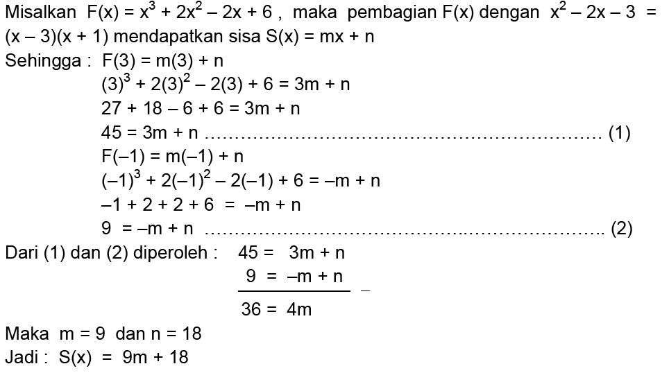 Kamu akan diajak untuk memahami materi hingga metode menyelesaikan soal. Nah pada kesempatan kali ini saya akan menjelaskan tentang materi teorema sisa dan teorema faktor beserta contoh soal. Sebenarnya sisa pembagian suatu suku banyak sudah kita bahas pada artikel operasi pembagian suku banyak dimana untuk menentukan sisanya bisa menggunakan dua cara yaitu cara bersusun dan cara skema horner. Soal soal cerita teorema faktor. Teorema faktor adalah salah satu teorema pada submateri polynomial. Suatu suku banyak fx dibagi sisa 2 dibagi sisa 3.