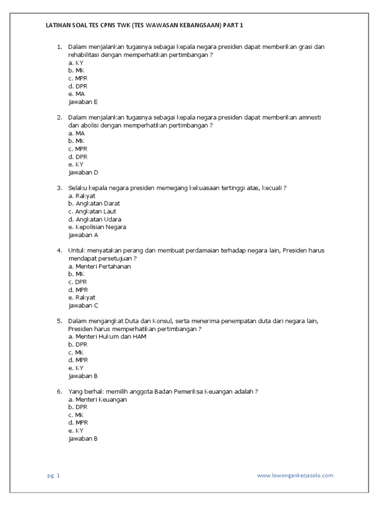 Mohon izin dan minta softcopy untuk semua contoh soal cpns yang mba punya juga ya mba yaahehe d ini email saya mba. Tes wawasan kebangsaan merupakan tes yang sangat penting karena merupakan salah satu poin tes cpns untuk mengukur serta menilai kemampuan peserta seleksi penerimaan cpns dalam penguasaan pengetahuan dan memahami serta meng. Tes wawasan kebangsaan twk merupakan salah satu tes kompetensi dasar yang wajib diikuti oleh para peserta dalam uji seleksi penerimaan cpns. Anda dapat berbagi informasi website ini dengan cara berkomentar yang baik dan bijak serta sopan. Soal soal tes wawasan kebangsaan twk ini digunakan untuk mengukur kemampuan wawasan kebangsaan para peserta tes cpns. Tujuan diberlakukannya tes wawasan kebangsaan adalah untuk menguji para peserta dalam kemampuan penguasaan kebangsaan indonesia yang meliputi pancasila uud 1945 bhineka tunggal ika dan negara kesatuan republik indonesia tata negara sejarah.