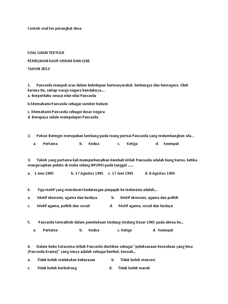 Download contoh soal tes perangkat desa dan kunci jawaban 2018. 110 prediksi soal perangkat desa terbaru 2020 dan jawabannya pdf yapp masuk ke soal prediksi tentang ujian perangkat desa. Kedudukan perangkat desa menurut pasal 1 angka 3 uu desa adalah pembantu bagi kepala desa dalam menjalankan fungsi pemerintahan. Desa swasembada kunci jawaban soal dasar negara pancasila 1a 11a 2d 12a 3a 13b 4d 14c 5. Link download soal ujian perangkat desa. Walau pun hanya bersifat contoh soal saja.