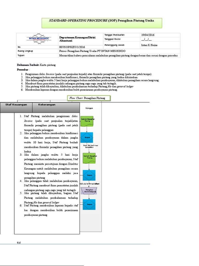Contoh sop bagian keuangan. Standar operating prosedur merupakan salah satu alat yang penting untuk memudahkan seseorang dalam menjalankan usaha dan tugasnya. Prosedur pengajuan belanja pegawai membuat permintaan gaji setiap awal bulan di ajukan ke kasubbag keuangan wasek dan pansek lalu di ajukan ke kppn tidak boleh lebih dari tanggal 10 setiap bulannya. Master sop menyediakan sop keuangan accounting contoh sop hrd contoh sop perusahaan contoh sop perusahaan jasa contoh sop administrasi contoh format sop standard operating procedure contoh sop keuangan contoh sop accounting contoh sop restoran standar operasional prosedur sop perusahaan jasa download sop sop kontraktor jobdesc sop rumah sakit sop hrd konsultan sop job desc. Dasar hukum undang undang nomor 28 tahun 1999 tentang penyelenggaraan negara yang bersih undang undang nomor 17 tahun 2003 tentang keuangan negara undang undang nomor 15 tahun 2004 tentang pemeriksaan. Subbagian keuangan staf keuangan nama sop. Standar operasional prosedur atau sop adalah panduan terdokumentasi berisi metode khusus untuk melakukan tugas secara konsisten demi menjamin proses produk dan jasa sesuai dengan tujuannyacontoh sop keuanganfinance.