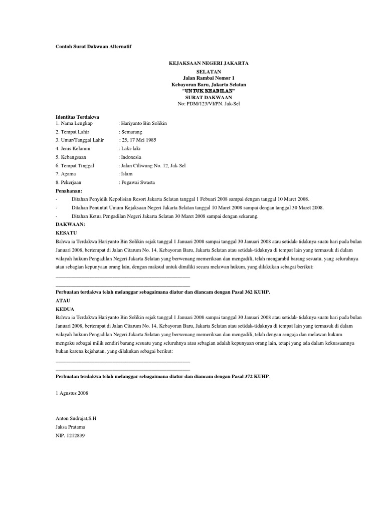 Bahwa ia terdakwadst. Contoh surat untuk ibu yang menyentuh hati. Bahwa ia terdakwadst melanggar pasal 338 kuhp kedua. Itulah mengenai beberapa contoh surat dakwaan tunggal dalam berbagai kasus sebagai referensi membuat surat tuntutan yang baik dan benar. Primair bahwa saudara serda sudar sebagai korban pada hari sabtu tanggal 29 april 1995 sekitar jam 1630 wita telah dianiaya atau dipukul oleh fasifikus krispianus yosep jaya dkk yang diajukan sebagai terdakwa dalam perkara pidana lain di km 10 desa mage ponda berjalan sepoyong menuju ke arah barat dengan keadaan berlumuran darah menuju hutan masakea yang masuk daerah hukum. Contoh surat dakwaan kumulatif.