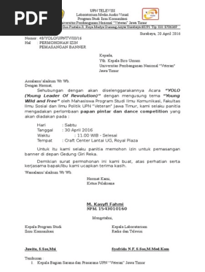 Demikianlah surat pernyataan ini dibuat dengan sebenar benarnya dan dapat dipergunakan seperlunya. Tata usaha rumah tangga rektorat ugm di tempat sesungguhnya segala puji hanyalah milik allah swt yang tiada ilah yang haq kecuali dia. Sehubungan dengan akan diadakannya sambut maba ub 2013 dengan tema ikhlas bersaudara karena kita brawijaya maka kami selaku panitia memohon izin pemasangan spanduk ini. Baik itu surat yang dipergunakan oleh perusahaan instansi pemerintahan lembaga organisasi dan perseorangan. Contoh surat permohonan izin pemasangan spanduk. Coretan pena contoh surat contoh surat ijin pemasangan baliho.