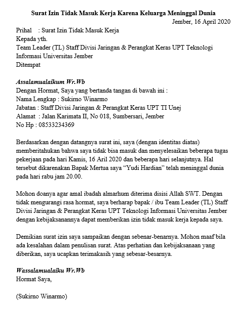 Contoh surat izin tidak masuk kerja karena acara keluarga. Sebenarnya tidak masalah asalkan surat izin jelas dan alasannya bisa dimaklumi.
