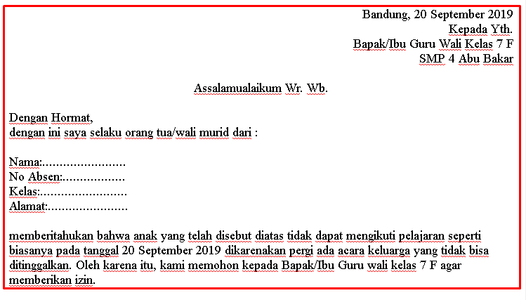 Bapak guru wali kelas x mipa a sma negeri 1 jakarta. Jalan turi raya no. Namun satu jenis surat izin yang paling sering digunakan adalah surat izin tidak masuk kerja. Ingat surat ini jangan disalagunakan untuk membolos dan lain sebagainya. Muhammad alfatih kelas. Surat izin ini biasanya dibuat oleh siswa yang kebetulan mendapatkan halangan tertentu contoh.