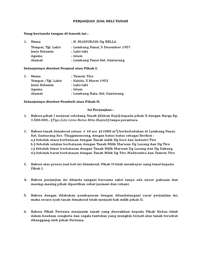 Jalan watugudang panjaitan no. Namun pada umumnya hal pernyataan pembebanan biaya ini dibebankan pada pihak kedua atau pembeli. Contohnya untuk tanggungan biaya ketika ingin melakukan balik nama pajak iuran dan biaya lahan lainnya. 34 tahun pekerjaan. Pada artikel sebelumnya kita telah membahas mengenai surat perjanjian jual beli rumah sederhanapada artikel contoh surat perjanjian jual beli tanah terbaru kali ini kita akan membahas mengenai topik yang hampir sama. Pada waktu pelaksanaan jual beli tanah tersebut baik pihak ke i penjual maupun pihak ke ii pembeli juga saksi saksi semuanya meyatakan satu sama lain dalam keadaan sehat wal afiat baik jasmani maupun rohani dan segala sesuatu dengan itikad baik.