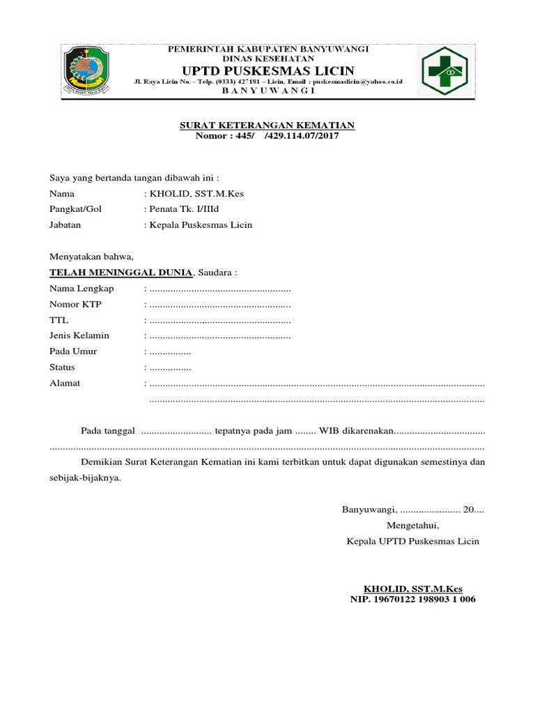 Terakhir suami saya mengalami sakit jantung dan setiap dua minggu sekali ke klinik untuk mendapatkan resep pengobatan dari dokter. Terkadang untuk pengurusan pemakaman kita membutuhkan surat keterangan kematian dan biasanya surat yang digunakan untuk pemakaman ini dikeluarkan oleh dokter di rumah sakit rt atau rw setempat atau bisa dari desa. Kebumen 17 mei 1952. Kartu asterik penduduk almarhum. Surat ini memang seringkali diminta oleh warga untuk mendapatkan keringanan biaya di rumah sakit yang ditunjuk. Surat kematian dari rumah sakit jika meninggal di rumah sakit 3.