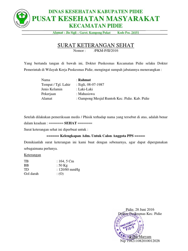 Contoh surat keterangan sehat dari puskesmas sebagai informasi tentang surat keterangan sehat dari puskesmas dengan format resmi. Surat ini menjadi salah satu dokumen pelengkap yang harus dimiliki jika mendaftar pada instansi atau perusahaan tertentu. Dokter atau petugas akan menuliskan surat keterangan. Definisi dan kumpulan contoh surat keterangan sakit dari dokter dalam bahasa inggris. Dan surat tersebut ditandatangani oleh pemeriksa dan dicap institusi. Surat keterangan dokter dibutuhkan saat melamar pekerjaan dan mendaftar sekolah atau kuliah.