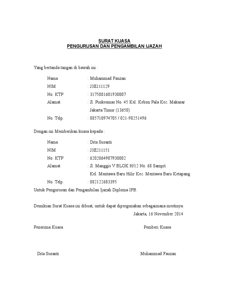 Contoh surat kuasa pengambilan ijazah. Itulah 7 contoh surat kuasa orang meninggal kami berharap contoh surat yang kami sampaikan dapat membawa manfaat untuk anda dan bila dirasa anda masih kurang puas dengan contoh surat dari kami maka kami memohon maaf sebesar besarnya karena kami menyadari bahwa blog ini masih jauh dari kata sempurna untuk itu kami mohon masukan dan saran dari anda demi kemajuan blog ini. Ijazah merupakan dokumen yang sangat penting bagi setiap orang dan biasanya selalu digunakan saat ingin melamar pekerjaan.