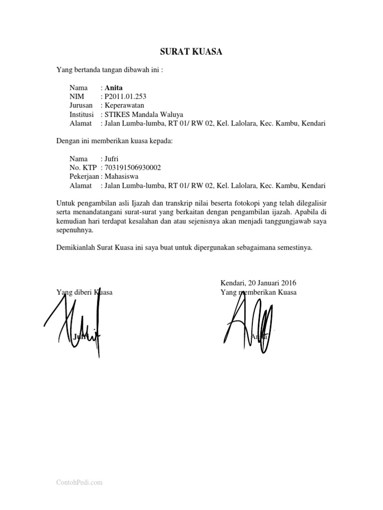 29 contoh surat kuasa berbagai keperluan yang benar surat kuasa pengertian fungsi macam unsur gurupendidikancom untuk pembahasan kali ini kami akan mengulas mengenai surat kuasa yang dimana dalam hal ini meliputi pengertian fungsi macam dan unsur nah agar lebih dapat memahami dan dimengerti simak ulasan selengkapnya dibawah ini. Walaupun anda menamatkan pendidikan sarjana namun jika tidak memegang ijazah maka. Setahu kita dalam kehidupan ada banyak kali kita tidak bisa melakukan sesuatu hal dan kita akan perlu orang yang lain membantu seperti ketika mengambil dokumen membayar pajak legalisir ijazah dan lain lain.
