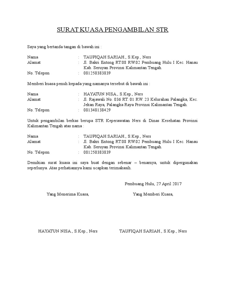 Contoh surat kuasa pengambilan str. 15 contoh surat kuasa pengambilan str paling lengkap bagi anda yang alumni dari fakultas kesehatan tentunya sudah tahu dengan str. Yah str adalah surat tanda registrasi yang diberikan oleh pemerintah kepada tenaga kesehatan yang sudah memiliki kompetensi. Maharesi hefri yudo ah alamat. Mungkin disebabkan karena anda sudah ada di luar kota untuk bekerja atau keperluan lain sebagainya. Contoh surat kuasa pengambilan str bagi para alumni dari fakultas kesehatan tentu sudah tidak asing lagi dengan str. Contoh surat kuasa yang akan kita bahas pada artikel kali ini bukan saja hanya sebatas contoh surat kuasa melainkan begaimana cara membuat format surat kuasa yang benar untuk referensi bagi anda yang sedang membuat surat kuasa.