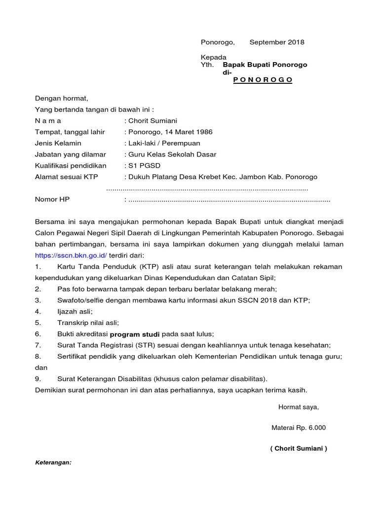 Sebenarnya calon peserta seleksi cpns juga bisa mengunduh melalui images for contoh surat lamaran cpns 2018. Surat lamaran lebih ke arah penegasan soal identitas dan jabatan atau formasi yang akan dipilih pelamar di pendafataran cpns 2019. Ini contoh surat lamaran cpns 2019 dan surat pernyataan cpns 2019 untuk sma s1 s2 dan diploma 25 contoh surat lamaran cpns 2019 untuk diunggah ke portal sscasnbkngoid unduh di sini. Sebagai bagian dari surat resmi surat permohonan kepada bupati harus memenuhi kaida kaidah dan aturan tertentu. Tribun timurcom ini contoh surat lamaran cpns 2019 instansi kabupaten kota. Bulan september 2018 ini informasi penemerimaan cpns telah dikeluarkan secara resmi melalui situs.
