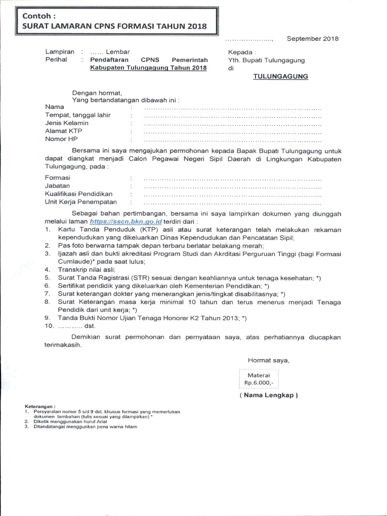 Contoh surat lamaran untuk cpns. Surat lamaran adalah surat resmi yang ditujukan kepada sebuah perusahaaninstansi dengan tujuan untuk mengajukan diri sebagai pekerja atau dalam hal pns adalah abdi negara. Contoh surat lamaran cpns ini kami tulis sebagai bahan rujukan bagi kamu yang sedang mempersiapkan diri untuk mengikuti seleksi masuk sebagai pegawai negeri sipil cpns. Meski baru calon contoh surat lamaran cpns ini tidak bisa dianggap remeh. Nah bagi anda yang sedang membutuhkan referensi tentang bagaiman cara membuat surat pernyataan cpns berikut ini kami sediakan contoh surat pernyataan cpns untuk lulusan sma di salah satu kementerian yang kebetulan di tahun 2018 ini sedang membuka pendaftaran cpns. Sebenarnya calon peserta seleksi cpns juga bisa mengunduh melalui images for contoh surat lamaran cpns 2018. Namun untuk lebih jelasnya saya juga akan membagikan contoh surat lamaran cpns 2018.